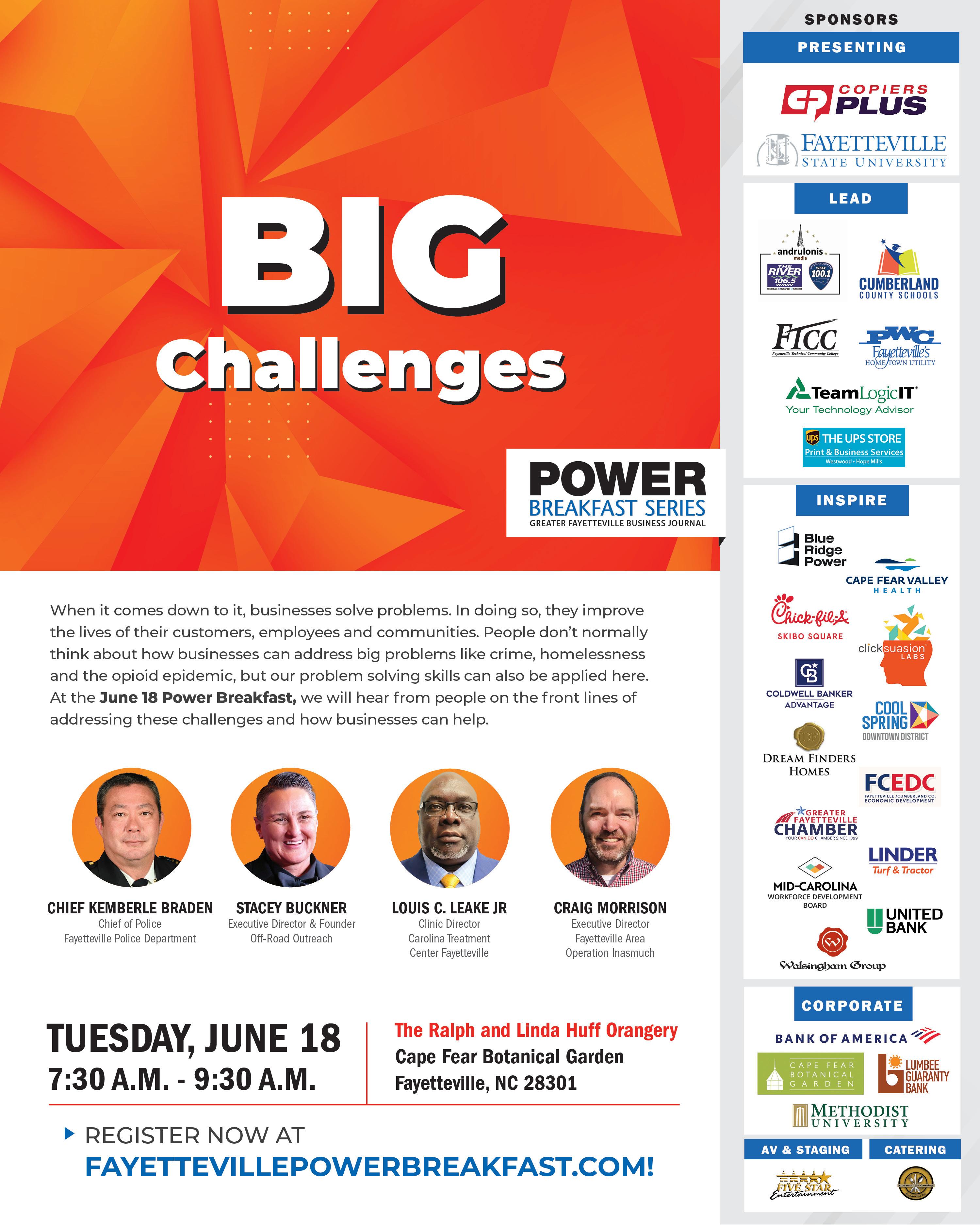 POWER BREAKFAST PANELISTS TO TACKLE "BIG CHALLENGES" WITHIN FAYETTEVILLE