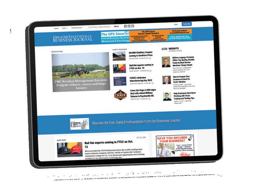 The Greater Fayetteville Business Journal is published twice a month throughout Fayetteville and the Cumberland County region. News related to the region’s business sector is posted daily at bizfayetteville.com.