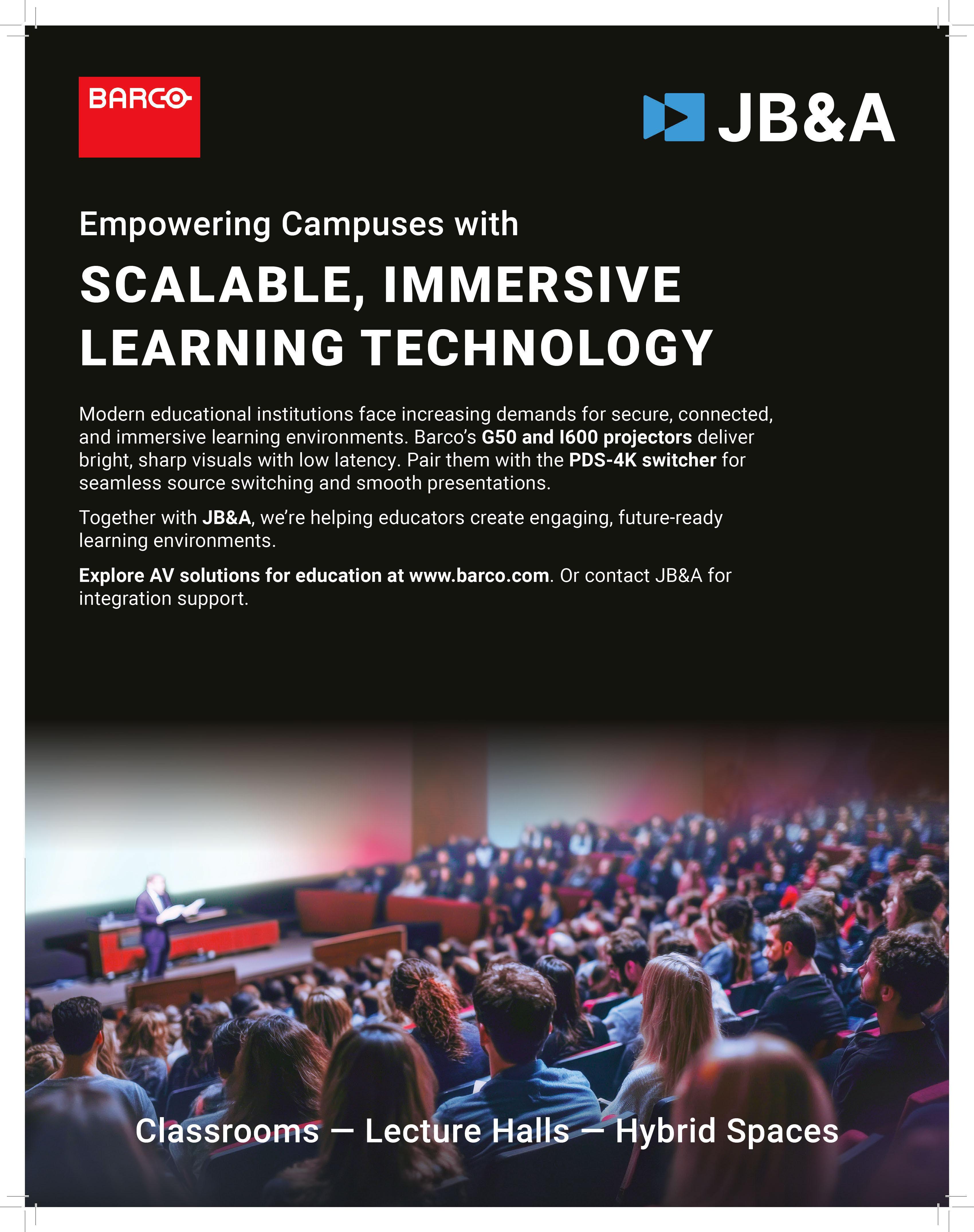 environments, enabling seamless switching between multiple content sources with 4K clarity. Its intuitive operation allows instructors to engage students with dynamic visuals and flexible presentations, both in-room and remote. When paired with a compact yet powerful projector like the Barco G50, educators unlock an ideal solution that creates an interactive, future-ready learning experience for today’s classrooms.