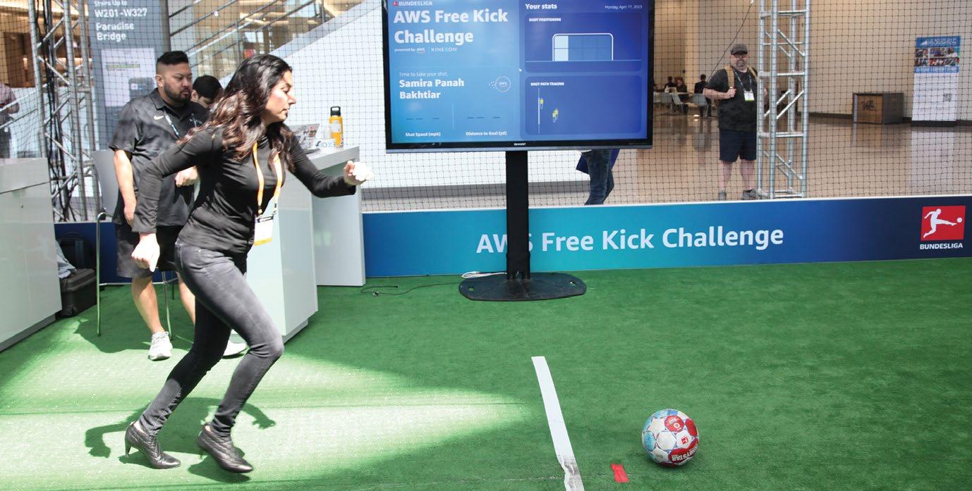 5 Walking into the West Hall, you might have been greeted by the sounds of an exuberant “crowd” as attendees shoot to score at the AWS Free Kick Challenge. 2 Brett Dellandre, a senior engineer at VAST Data, stands bedecked in a “space suit” next to his fellow astronaut, also in a spacesuit. He says VAST Data is the “storage architect of the future!”