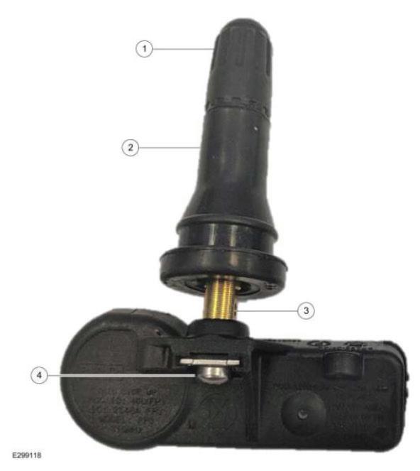 Pictured above are the individual components of the TPMS: cap (1), valve stem (2), valve air port (3) and bolt (4). Courtesy of FORD MOTOR COMPANY