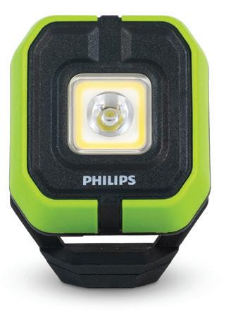 The Lumileds Philips Flood Mini LED Worklight, No. X30FLMIX1, is a compact LED floodlight that provides a bright white light up to 500 lm. For handsfree use, the Flood Mini features a 360-degree hook and a tilting handle with soft-touch plastic to protect painted surfaces. The light is rated IP65/IKO8 for resistance to impacts, water, and dust and provides up to eight hours of use from a single charge. A USB-C charger and cable are included.