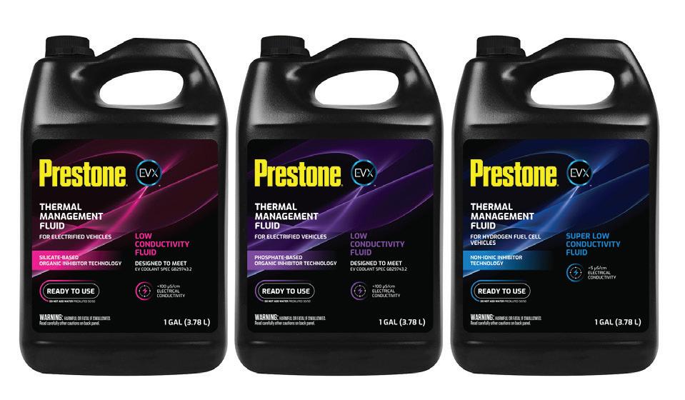 Prestone ’s EVX line of electrified vehicle thermal management fluids is engineered for both light- and heavy-duty EVs, offering low electrical conductivity, corrosion resistance, and stability under high-voltage conditions. Tested to meet accelerated global standards, including China’s GB29743.2 and ASTM D8566, the fluids help OEMs ensure safety, compliance, and performance. Available in phosphate-, silicate-, and non-ionic formulations, the EVX fluids are designed for battery-electric applications, fuel cell vehicles, and more.