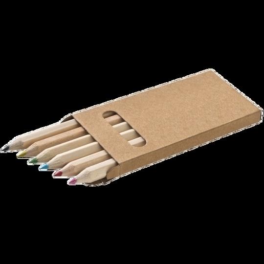 Zestaw kredek drewnianych mini, który zawiera 6 sztuk, zapakowany w tekturowym opakowaniu.