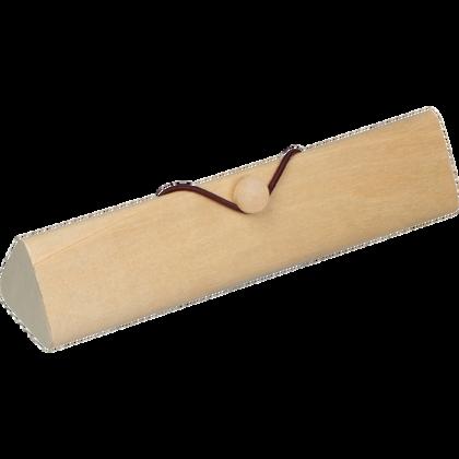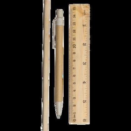 Zestaw spakowany w drewniany piórnik składający się z: linijki, ołówka, gumki do zmazywania, temperówki i długopisu.
