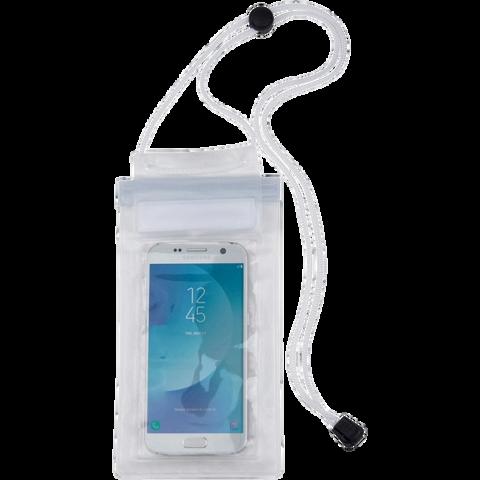Etui na telefon z PVC, szczelnie zamykane, dodatkowo posiada sznurek do zawieszenia woreczka na szyi. Produkt w transparentnym kolorze.