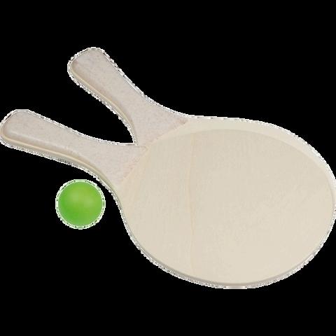 Zestaw plażowy do gry, zawiera dwie paletki wykonane z drewna z plastikowym uchwytem oraz piłeczkę. Paletki zapakowane w siatkę.