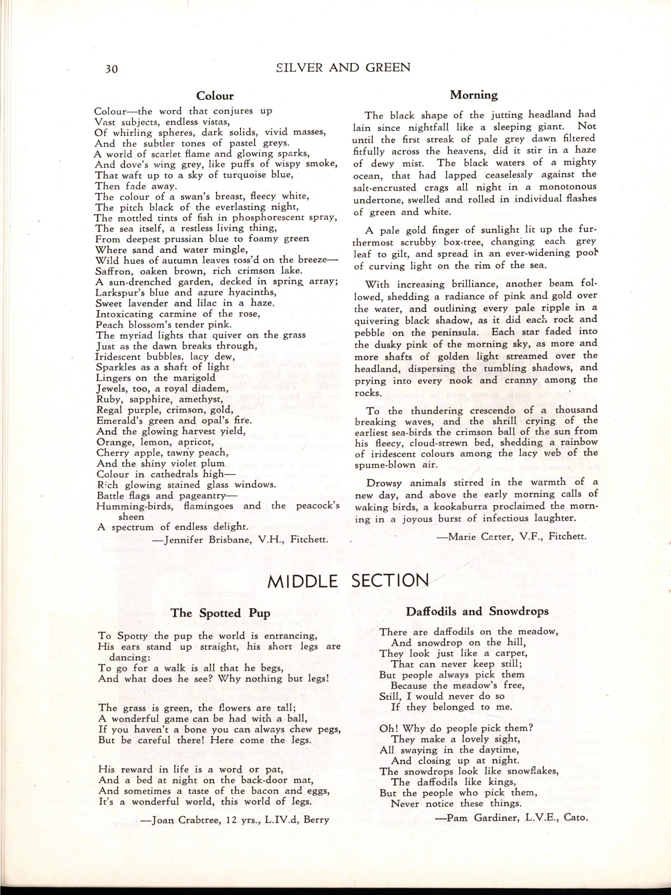 An d then the evening sky grows gold— The long grey shadows fall, The cattle to their stables go, An d darkness covers all —Kerry Forrest, 12 yrs., L.IV.b, Krome