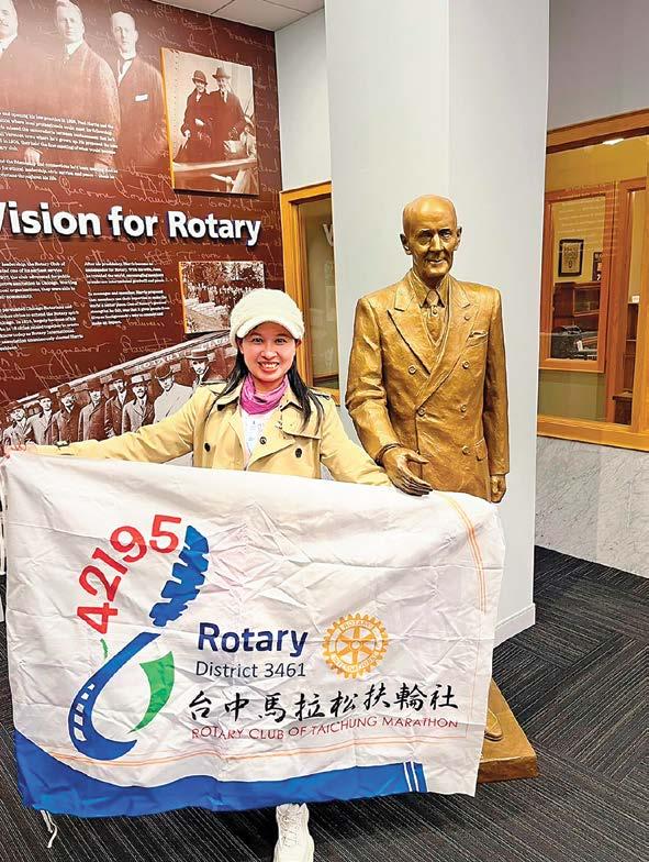 跑步旅行──串連全世界,扶輪友誼──串連全 世界。挑戰世界六大馬拉松賽事,芝加哥馬拉松賽 事,參觀芝加哥國際扶輪總部,參與芝加哥的The Barrington Rotary Club扶輪社例會,為賽事行程增 添了豐富美好回憶。Angel感謝扶輪前輩們的指導與 支持,人生路上貴人相助。期許在跑步中完成更多人 生目標,用毅力、信心、健康跑向全世界,更希望有 機會串連全世界扶輪友誼。