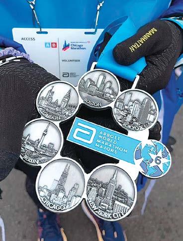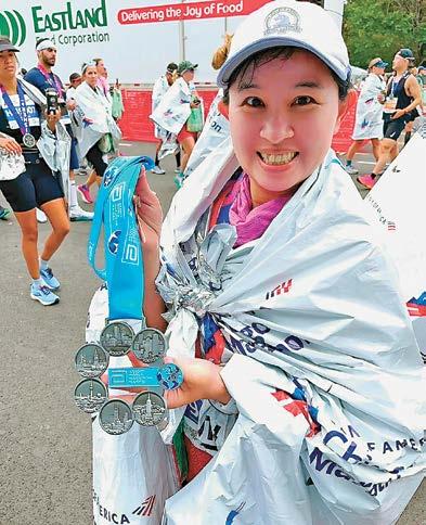 計畫,改為一年五馬。2023年3月5日日本東 京馬拉松、4月17日美國波士頓馬拉松、4月 23日英國倫敦馬拉松。挑戰短短6天內,跨國 連馬,美國及英國,克服時差及體能恢復,順利 完賽。芝加哥馬拉松,已完賽五大馬,心情很 興奮,終點處,有亞培世界六大馬拉松甜甜圈,