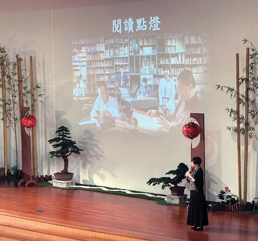 今天的心靈講座的題目是《閱 讀點燈》,主講者是《名人書房》 主持人詹慶齡女士,她是臺灣有線 電視新聞台第一代資深主播及製作 人。她表示:在網路資訊充斥的時 代裡,很多人都遺棄了實體書本; 其實,閱讀不僅是讀一本好 書,也 是讀取每個人的生命經驗,從他們的 身上,看到生命的寬度與厚度,成為 汲取的養分。在咀文字的過程中,可 以沉澱、觸發思考、探索自性,透過 一點一滴累積,豐富想像力與創造 力,成為更好的自己讀一本好書,豐 富視野,如同點一盞明燈,照亮生命