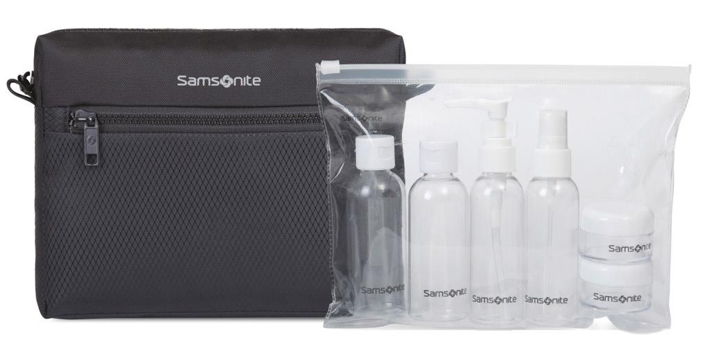 This travel-friendly set includes a zippered toiletry bag with a front zippered pocket, a clear plastic zippered bag, four 3-oz bottles with squeeze, spray, pump and pour lids, and two 3-oz tubs with screw-on lids so you can bring your favorite products with you, wherever you go.