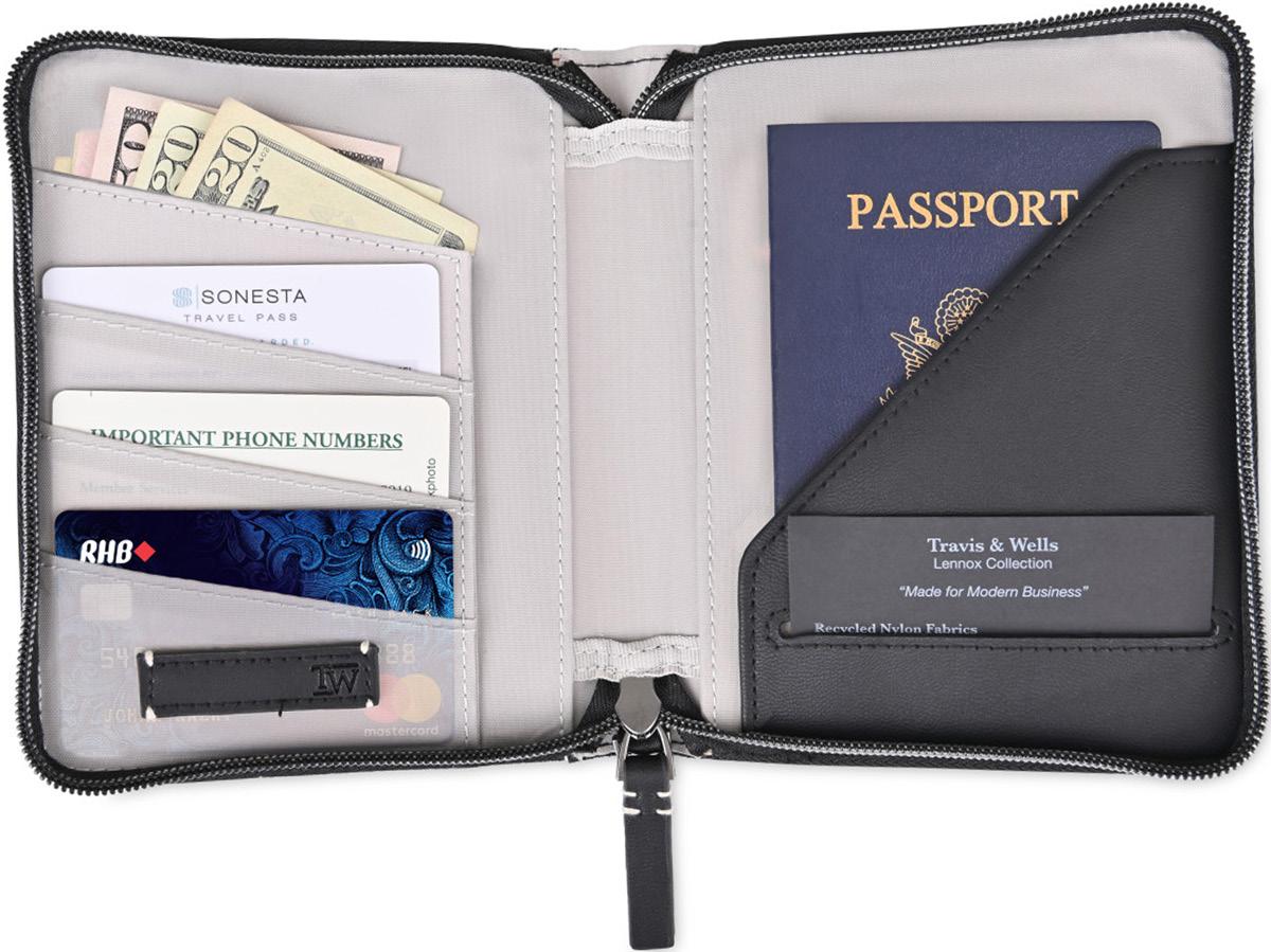 Keep all your valuables in one place with this zippered passport wallet. With pockets for cash, small documents, and up to four credit cards, your items will stay safe and secure as you travel.