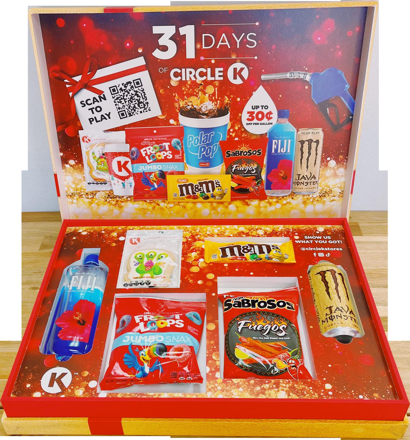 Every month Circle K runs a game for consumers to win free snacks, beverages, and fuel discounts. For the month of December they sent a special box to social media influencers to share across platforms called the "31 Days of Circle K" this box was a viral success and featured on "The Jennifer Hudson Show".