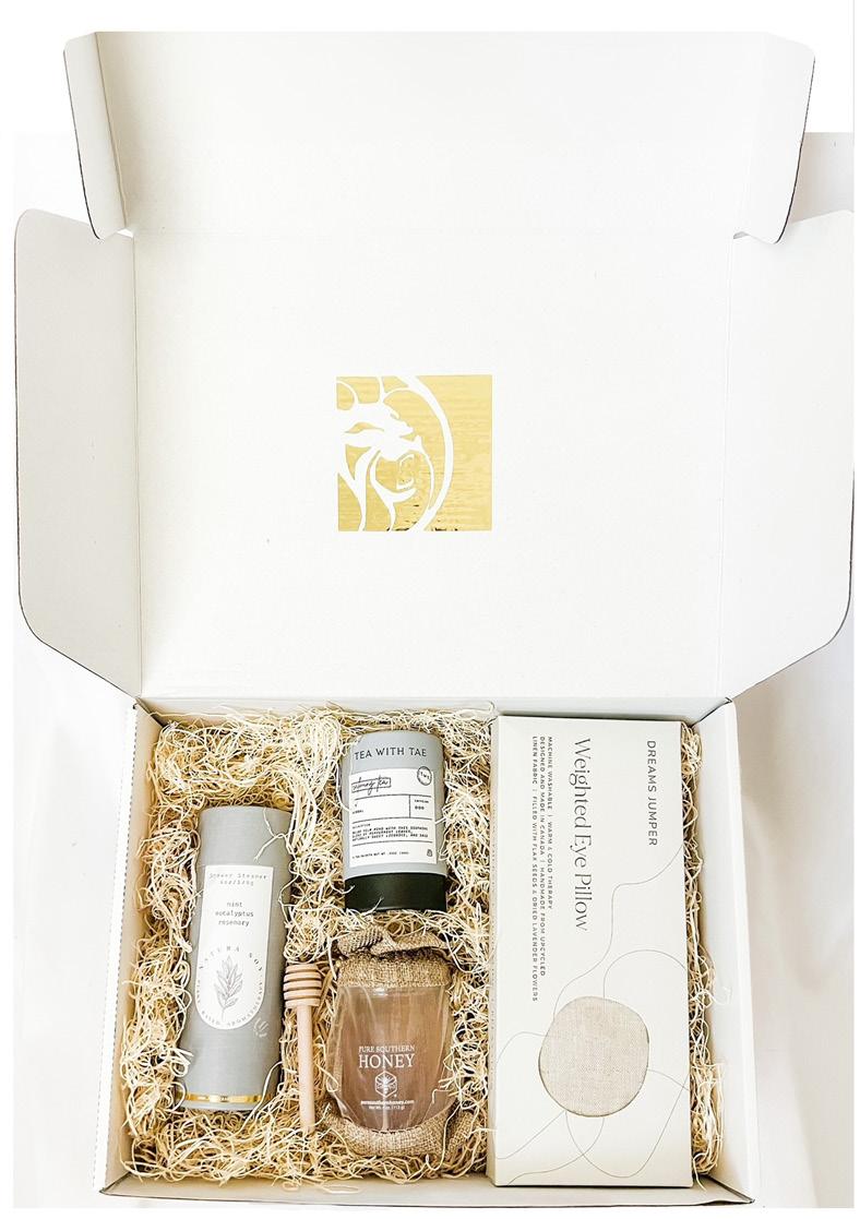Relax and recuperate with this gift set. Includes spa robe, weighted eye pillow, eucalyptus + sage shower steamers, calming tea, and pure honey. Packaged in a white gift box with your logo with a branded handwritten note.