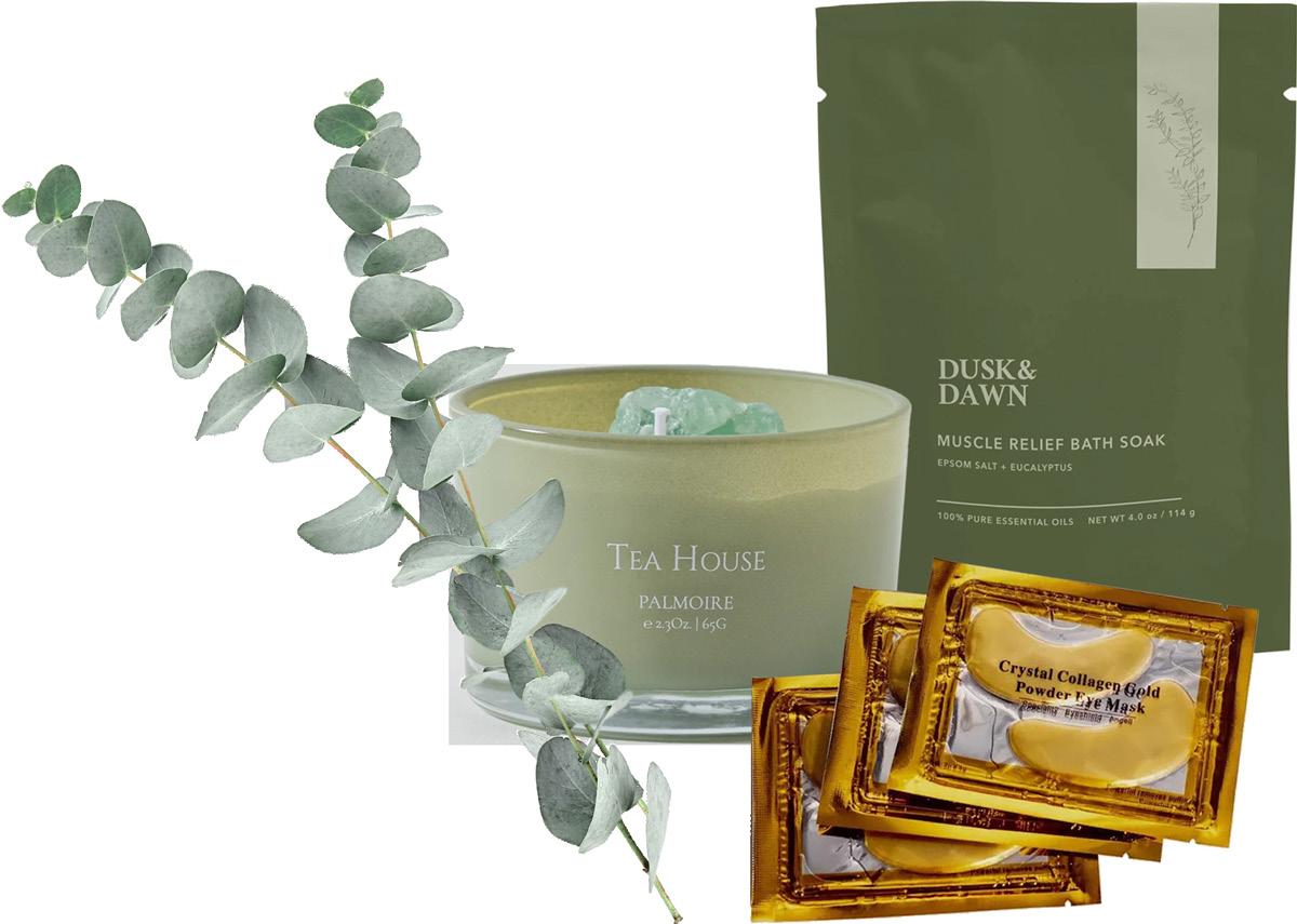 Wedding vibes in a box! This set includes Dawn + Dusk Muscle Relief Bath Soak, a 3 oz Tea House candle (scent notes of green tea, lemon and jasmine), a pack of three Lux Glow Skin gold eye masks, and two faux eucalyptus stems. All this comes beautifully packaged in a white branded gift box with a branded handwritten card.