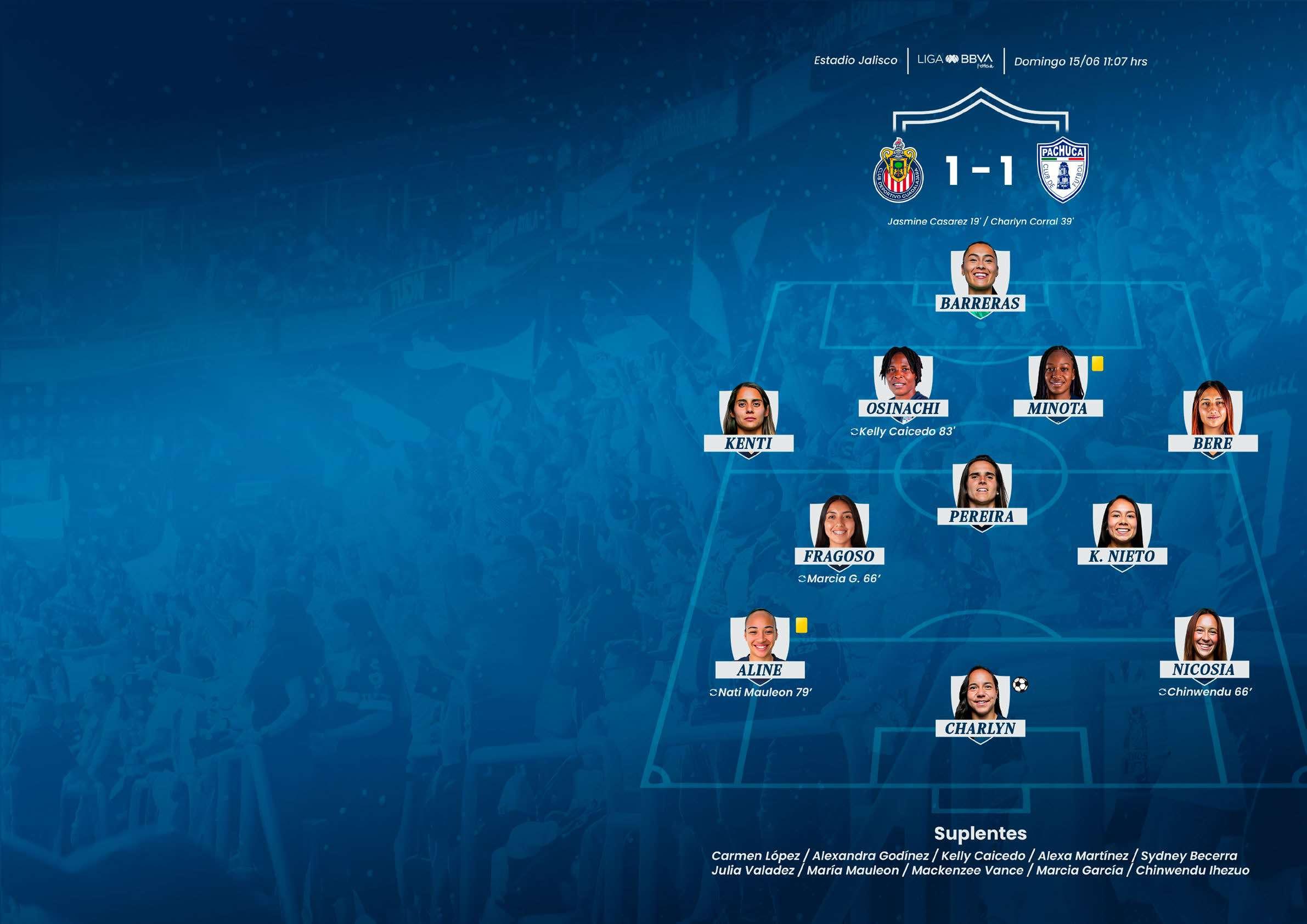 Yirleidis Minota, Berenice Ibarra; Karla Nieto, Andrea Pereira, Abril Fragoso (Marcia García 66’); Nina Nicosia (Chinwendu Ihezuo 66’), Aline Gomes (Nati Mauleon 79’) y Charlyn Corral.