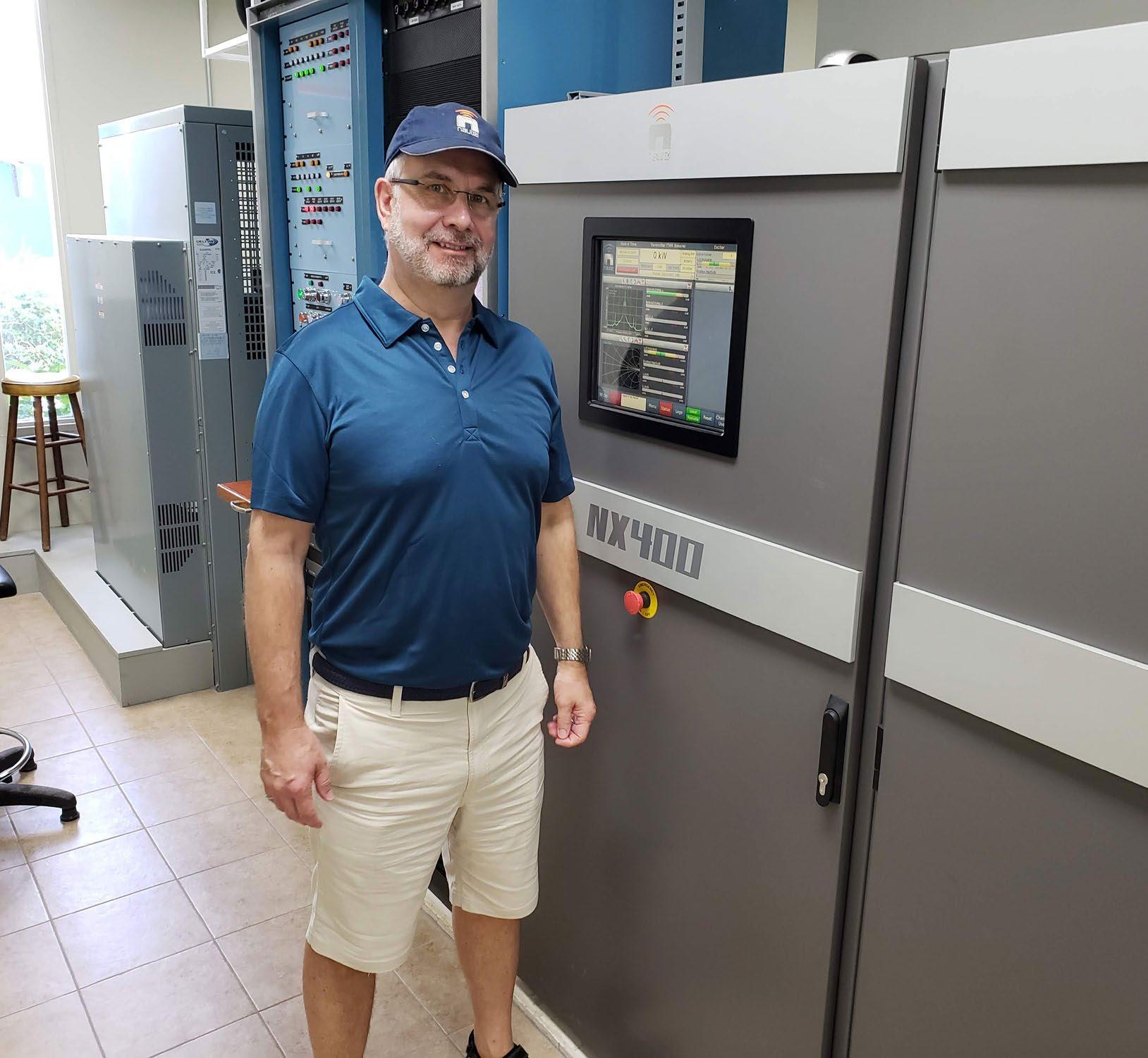 Above Rodgers with the Nautel NX400 transmitter used by Trans World Radio on Bonaire. Its output power is 440,000 watts.