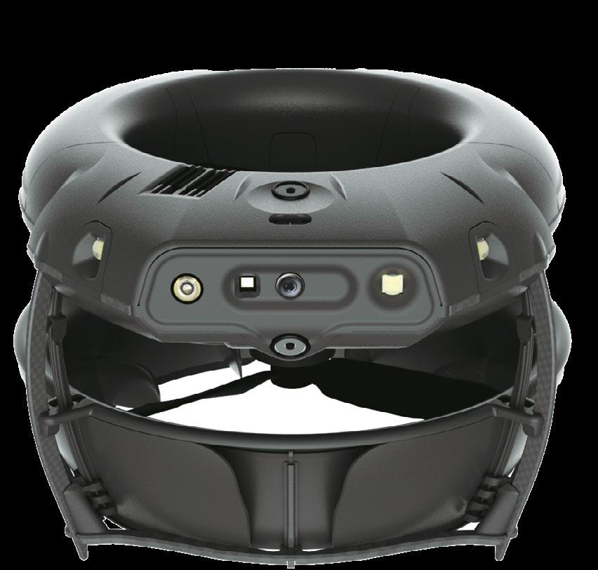 Dronut DD1 is designed to operate with precision in tight indoor environments and GPS-denied spaces. The top and bottom cameras are capable of 1280x800 real-time video streaming, while the main camera shoots 3840x2160 video for recording and 1280x800 for streaming. For navigation in very low lighting, it has omnidirectional LED lights and 6-axis proximity sensing. The Dronut DD1 also carries a rear camera with proximity sensing, LED lighting, and real-time HD video. Powering the system is a fast-charging USB-C connection, failsafe power, and onboard power monitoring. The system’s ground controller unit is laid out around an 8in. 1920x1200 pixel touch screen display. On that device, two-axis joysticks can maneuver the craft at a range of over two miles.
