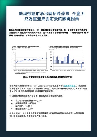 根據美國勞工統計局(Bureau of Labor Statistics)最新公布的《就業情勢報告》,12 月非農 就業僅增加 5 萬人,低於 11 月下修後的 5.6 萬人,也不及市場預期的 6 萬人。失業率小幅降 至 4.4%,顯示即便招聘趨緩,裁員規模仍相當有限。 12 月的新增就業主要集中於少數、對景氣循環較不敏感的產業: ● ● ● ●