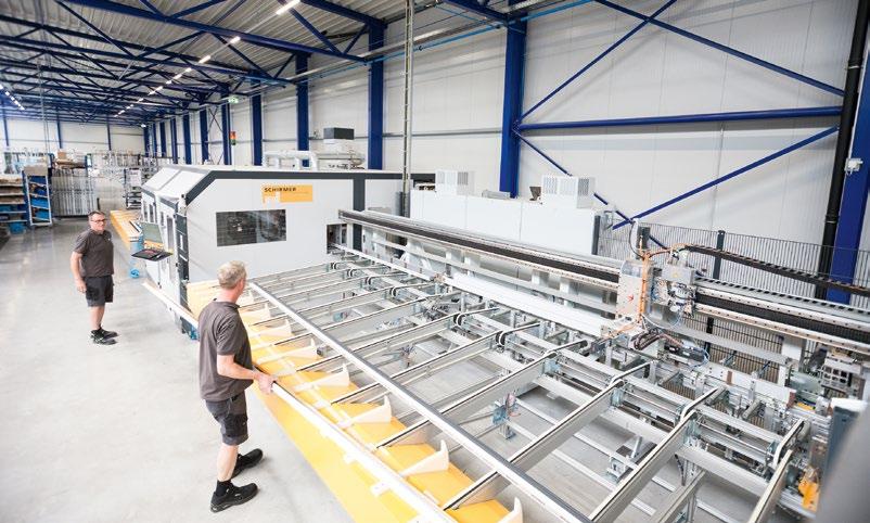 Kundenbeispiel: Die WIRUS Fenster GmbH & Co. KG in Rietberg nahm im April 2023 in einer neu errichteten Halle dieses Aluminiumprofil-Durchlaufzentrum in Betrieb. Es umfasst ein sechsspindeliges Ringmodul, eine 4-Achs-Schwenksäge von vorn sowie eine mit einem Werkzeugwechsler ausgestattete Kämpferkonturfräse. Bilder: Schirmer Maschinen