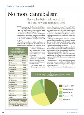 months of net orders,” he says. “With nearly 71,000 orders booked, the fourth quarter was the best quarter for Class 8 vehicles since the second quarter of 2006. “The ramp-up in demand is consistent with the up-cycle we have been forecasting for over a year, and confirms production levels will increase significantly in 2011.” Although truck tire pricing increased, not all the announced price increases stuck, especially earlier in the year. An 11R24.5 drive tire, load range G, averaged $389.16, which was up 1% compared to 2009 (MTD calculates dealer pricing in December). The segment remains highly competitive. The Big Three manufacturers account for 68.5% of the replacement truck tire market, but there are 18 brands with at least 1% market share (see Chart 17). Bridgestone Bandag Tire Solutions, Goodyear Tire & Rubber Co. and Michelin Retread Technologies Inc. represent 93.5% of the domestic retreading market (see Chart 18). An estimated 14.3 million retreaded medium and heavy truck tires were produced in 700 U.S. plants in 2010. That’s a 10% increase in production compared to the previous year. The top 100 retreaders in the U.S. accounted for