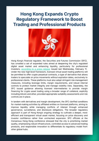 Hong Kongʼs financial regulator, the Securities and Futures Commission SFC, has unveiled a set of expanded rules aimed at deepening the cityʼs regulated digital asset market and enhancing liquidity, particularly for professional investors, according to a press release issued last Wednesday, February 11. Underthenewhigh‑levelframework,licensedvirtualassettradingplatformswill bepermittedtooffercryptoperpetualcontracts,atypeofderivativethatallows traderstospeculateonpricemovementswithoutexpirationdates,exclusivelyto professionalclients.Theseplatformsmustalsoadoptstringentrisk‑management measures, including leverage limits, margin requirements, and robust internal controls to protect market integrity and manage volatility risks. Separately, the SFC issued guidance allowing licensed intermediaries to provide margin financing for crypto asset trading using a broader range of collateral, explicitly includingbitcoinandether,providedappropriatesuitabilityassessmentsandrisk controlsareinplace.