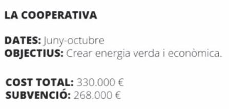 Un dels aspectes més destac a b l e s d ' a q u e s t p l a d ' i n v e rsions és la seva estructura de f i n a n ç a m e n t . D ' u n c o s t t o t a l previst de 1.243.000€, el 93% ( 1 . 1 5 6 . 0 0 0 € ) e s c o b re i x a m b s u b v e n c i o n s , m e n t re q u e només el 7% (87.000€) provindrà de recursos propis.