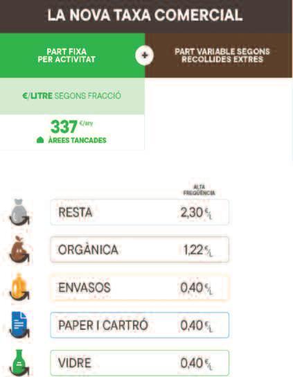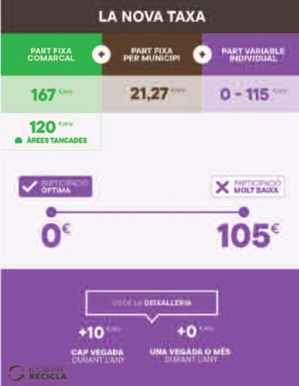 residus, la part fixa per municipi cobreix els serveis addicionals com ara el servei de recollida de voluminosos i poda, l’ús de la deixalleria, entre d’altres, i la part variable, és en funció de la correcta participació en el porta a porta i l’ús de la deixalleria