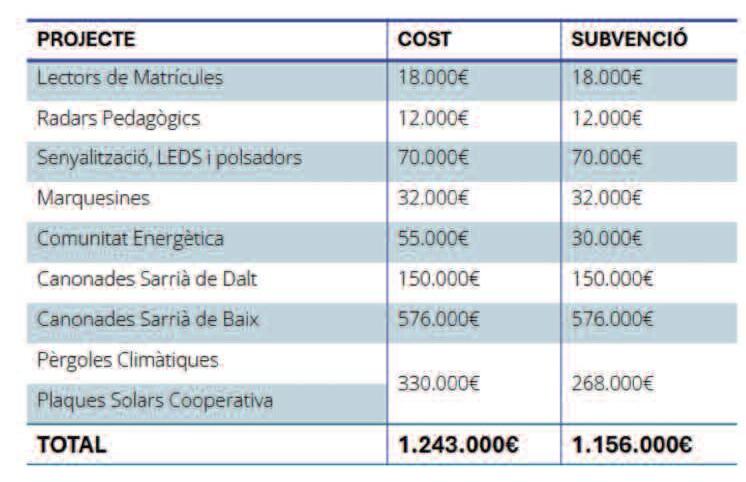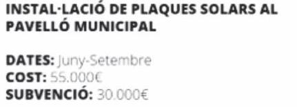 En aquest sentit, destaca la instal lació de plaques solars al Pavelló Municipal, un projecte que es desenvoluparà entre juny i setembre Permetrà generar energia per a l'ús del pavelló i, a més, possibilitarà la creació d’una comunitat energètica per als veïns de Sarrià de Ter La previsió és que aquest estiu ja es realitzin xerrades informatives per explicar els avantatges i el funcionament d'aquesta iniciativa, alhora que s’engegaran els tràmits per fer-ne la sol licitud