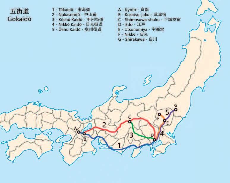 Cap a l’any 1600, un dels shogun (comandant de l’exèrcit i mandatari suprem) més important de la història del Japó, Tokugawa Ieyasu, va dissenyar un seguit de rutes per facilitar la comunicació entre el que llavors era la capital administrativa del país, Edo (actual Tòquio) amb la resta de territoris on es trobaven els nuclis importants de població Per aconseguir-ho es van dissenyar 5 rutes (Gokaido) que sortien del que es considera encara ara el quilòmetre zero de les carreteres japoneses, el pont de Nihonbashi, al centre històric de Tòquio