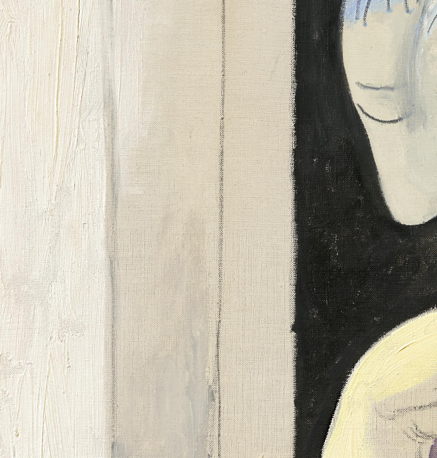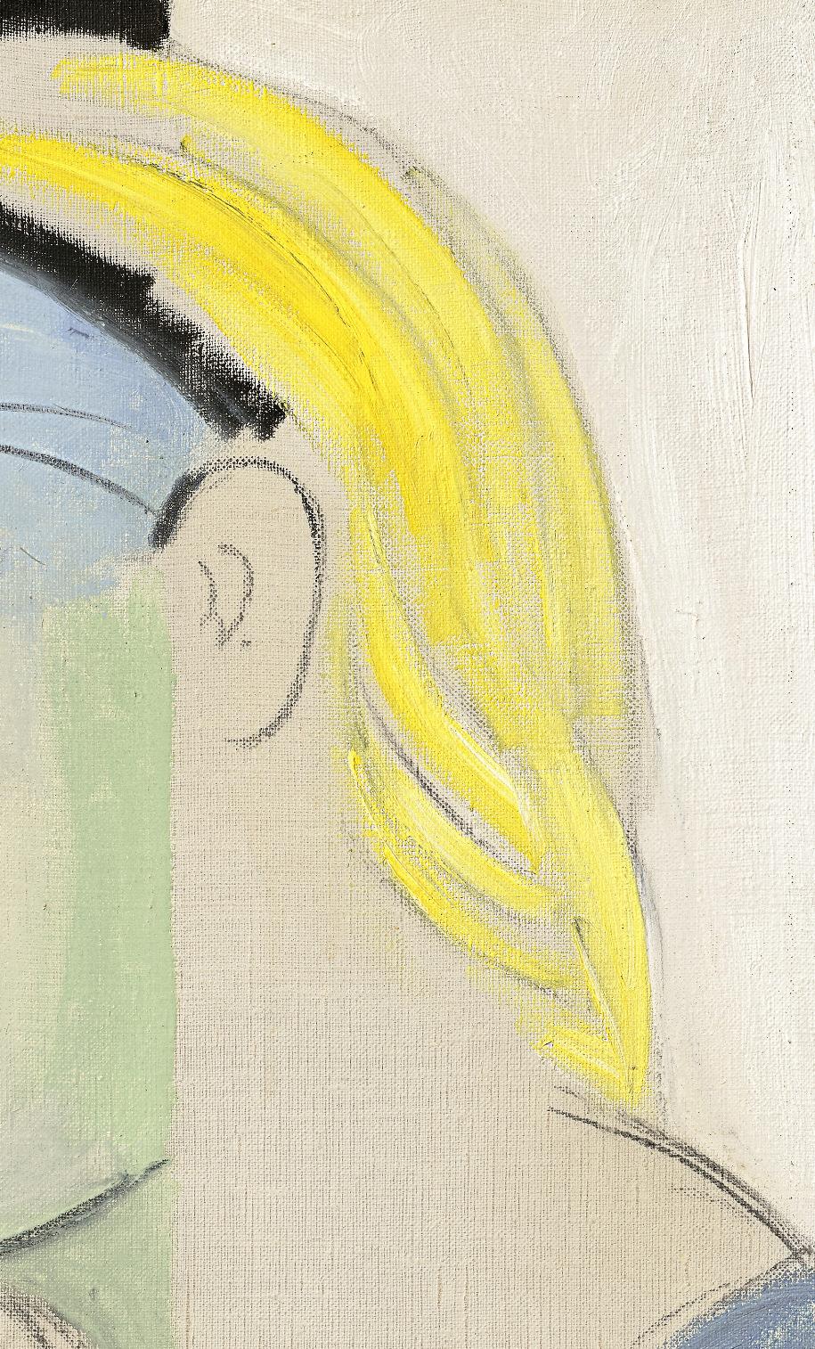 In Femme nue, the titular female protagonist gazes out from the composition wearing an expression of mild surprise, her head tilted slightly as she considers the viewer. Her body is made up of mellifluous, organic contours that flow, undulate and stretch into a series of interconnected, color-filled planes, with certain features enlarged and exaggerated in the process, drawing our focus to the curvature of her legs, her hips, her breasts. The elasticity of her form suggests an inherent capacity for metamorphosis, as if the woman’s profile may shift and change at any moment as she moves through the world. The interplay of deep, rich pigment across her body is complemented by the linear bands of color that fill the background, stacked atop one another and arranged at varying angles to create a dynamic sense of space and recession behind her form. As Jacques Dupin has noted, this nuanced, inventive use of color was an essential element in the success of this series, and reveals the artist’s distinctive skill and painterly precision: “All these paintings are highly colored, with vibrant resonances and acid flavors conforming closely to the treatment of the forms, in highly refined harmonies” (op. cit., 1962, p. 249).