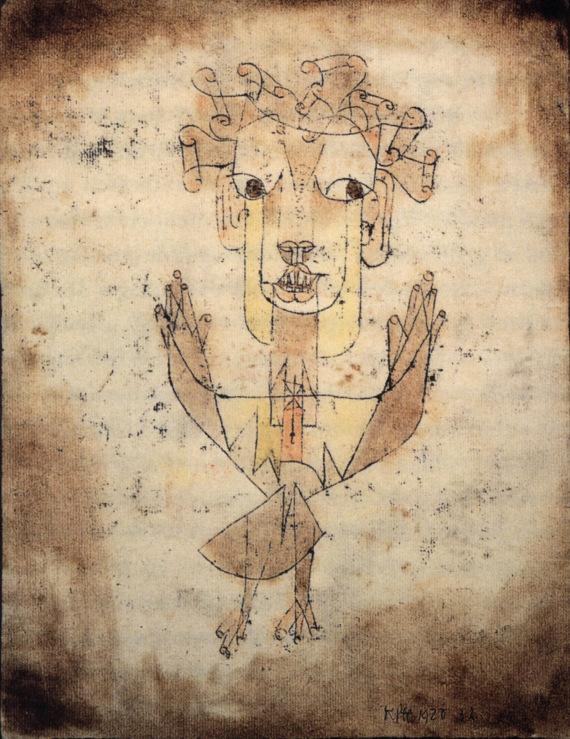 Klee’s Knabenbildnis also raises as many questions as it answers, the boy’s enormous starry eyes beseeching and baffling, the upside-down figure that accompanies the protagonist and is made of the same stuff (lines, angles, semicircles), most likely a younger self or a toy. Both figures are puppet-like, skeletal structures, translucent if not transparent. But all the young figure’s senses are alive. We know this because of the emphasis Klee places on the boy’s eyes, nose, lips, and fingers, the instruments of sight, smell, taste, and touch. The boy is a burgeoning imagination, leaving behind or throwing over (literally, over his shoulder) some earlier, smaller self. Or perhaps that’s not the story Klee means to tell. There’s no single key to unlock one of Klee’s works. Instead we’re offered openness, albeit closely structured, an invitation to the curious to explore.