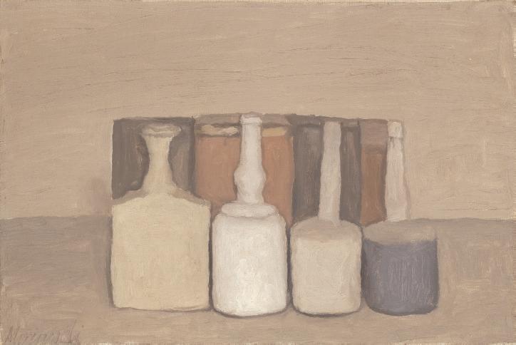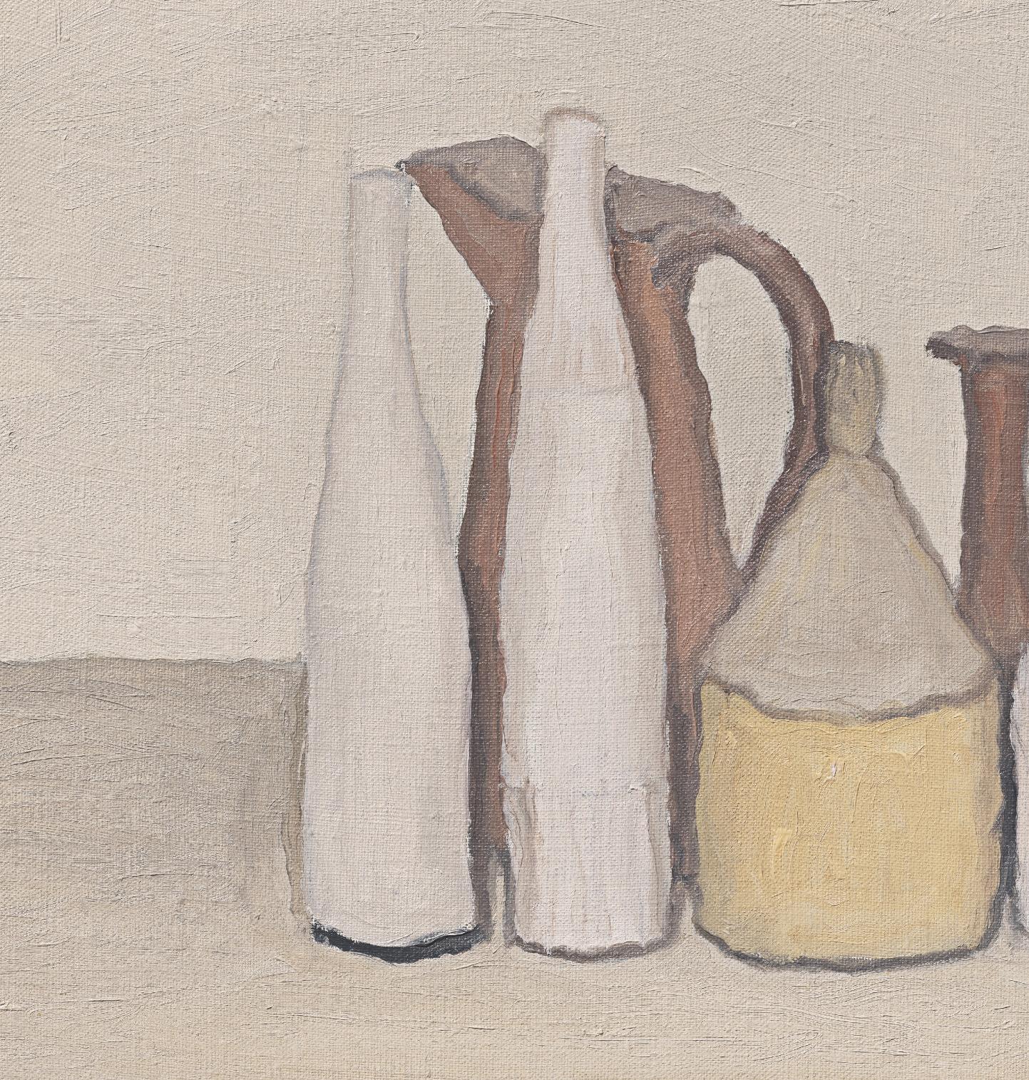 As with all of Morandi’s still lifes, the objects which populate the scene were personally selected by the artist from the extensive collection of items he kept in his studio. Often sourced from local flea-markets in his hometown of Bologna, and ranging from bottles to boxes, tins to vases and clocks, these objects were recurrent characters in his paintings, appearing in different guises and arrangements across numerous compositions. In most cases, they suggest a certain domesticity, as if they have been pulled from the kitchen or living room of Morandi’s home and appropriated for his artistic vision. However, by entering the world of the painter’s still lifes, they stand outside their original, intended function—to aid this, Morandi would eliminate all traces of an object’s former life before incorporating it into a scene, removing labels from bottles of oil and boxes of tobacco, pouring white paint into glass vessels to reduce the play of reflections and light on their surfaces, and anonymizing containers and tins by covering them with an even layer of matte paint.