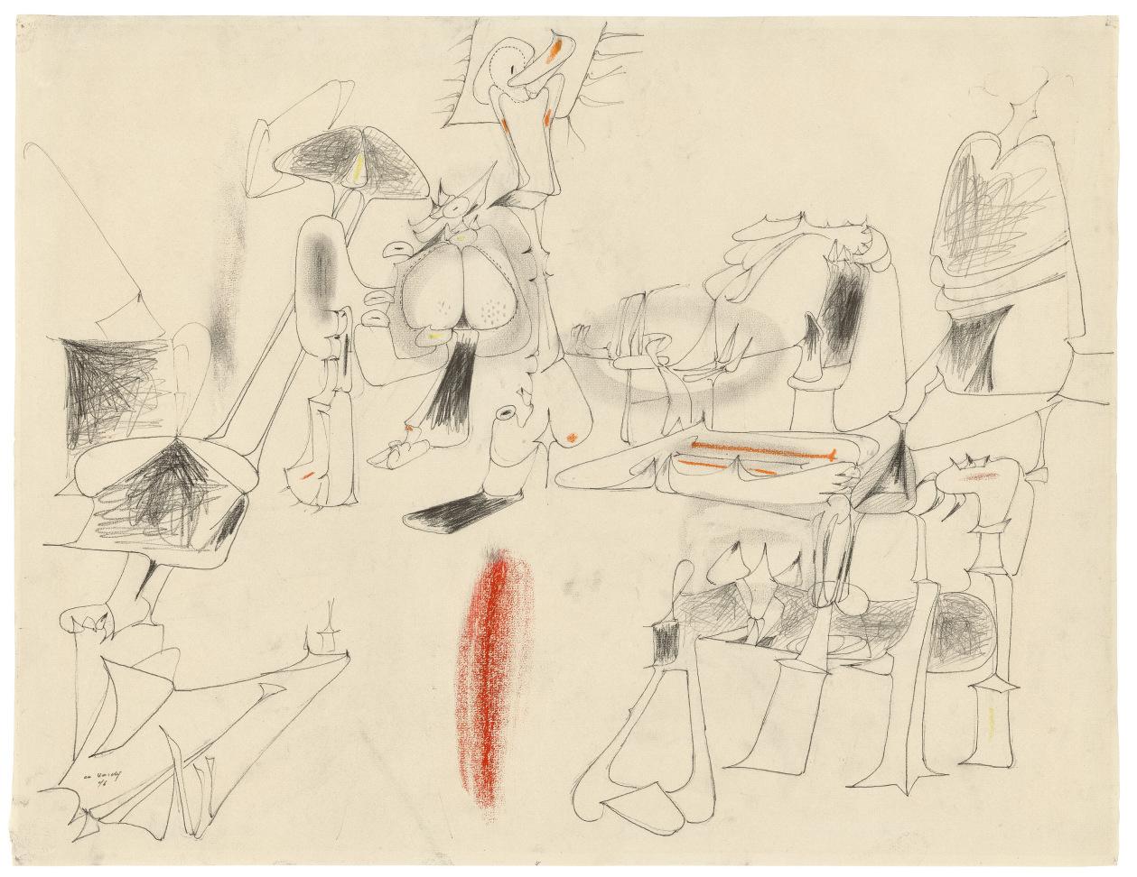 What interested American artists wasn’t modern art as a stylistic evolution from Fauvism to Cubism to Surrealism but how the genius of an artist, whether Ernst, Picasso, Miró, Matisse, or Mondrian, revealed fresh dimensions of the human imagination. Miró, although forever associated with the Surrealists (a term that goes back to Apollinaire) never liked seeing some stylistic label slapped on his work. In the 1950s, Robert Motherwell—a painter represented by a couple of collages in the Weis collection—wrote that “a sensitive balance between nature and man’s works, almost lost in contemporary art, saturates Miró’s art, so that his work, so original that hardly anyone has any conception of how original, immediately strikes us to the depths.” In Miró’s world everything is animate, beginning with the lines that in the Weises’ 1934 work Sans titre (Personnages) swoop and swerve, suggesting the anthropomorphic or zoomorphic, a perpetual metamorphosis. In the Weises’ Les flammes du soleil rendent hystérique la fleur du désert, the title underscores the interaction animating the composition, the sun in the upper right addressing the desert flower in the lower left, which responds excitedly, a metaphorical photosynthesis, the plant coming alive, almost human, as if greeting the sun. The composition is austere and ecstatic, contradictions united in ways maybe only a Spaniard could conceive. As for Femme nue, the third Miró in the Weis collection, her roiling body joins elements animal, vegetal, and mineral with a discombobulated energy that echoes the aggressively anti-classical forms of Antoni Gaudí, the great architect of Miró’s hometown, Barcelona. The openness of Miró’s metaphors and his sense of the rectangle of paper or canvas as a site for free play left a deep impact on American artists, immediately evident in Gorky’s work but also in the paintings of Jackson Pollock and many others.