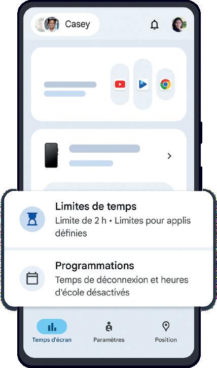 Définir des limites de temps d’utilisation pour chaque application ainsi que l’heure du coucher. Limiter les fonctionnalités et les notifications pendant les heures scolaires.