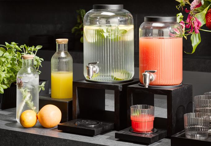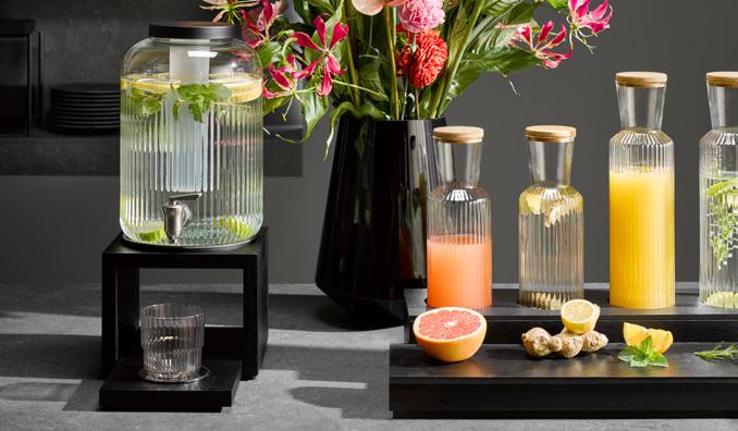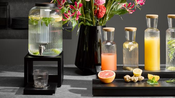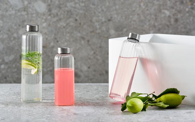 facettiertes Liniendesign, Trinkflasche aus Glas, Deckel aus Edelstahl faceted line design, glass drinking bottle, stainless steel lid diseño de líneas facetadas, botella de vidrio, tapa de acero inoxidable design de ligne à facettes, gourde en verre, couvercle en acier inox mit Schraubverschluss