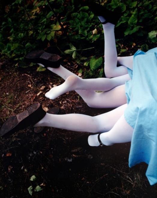 Untitled #25 (Override) (Gaskell, 1997) reveals a spider-like composition of legs that are sprawled out at different angles (see figure 2.6). These legs are those of Gaskell’s Alice’s, which are all wearing white tights and Mary-Jane shoes to portray the conventional appearance of Carroll’s Alice. The composition depicts the messiness of girlhood and the interwoven aspects of the collective struggles of teenage adolescence. The white legs work in contrast with the dark background and despite putting the Alice’s in a conventional fairytale setting adds the depth of isolation to the image.