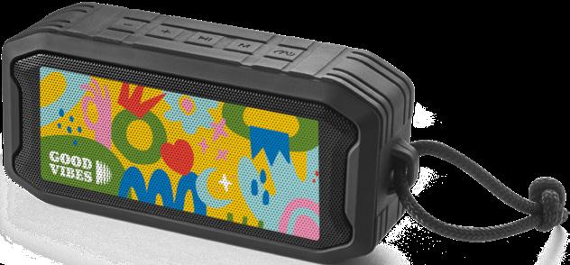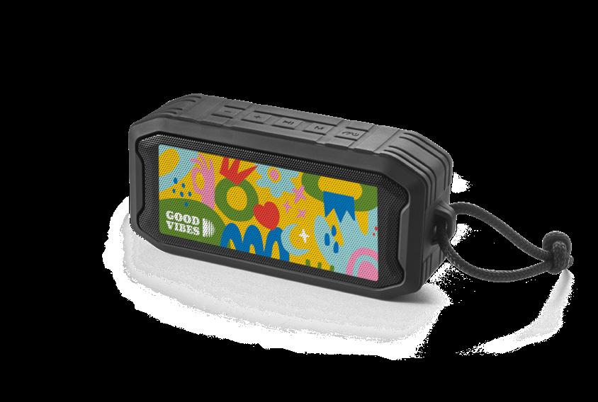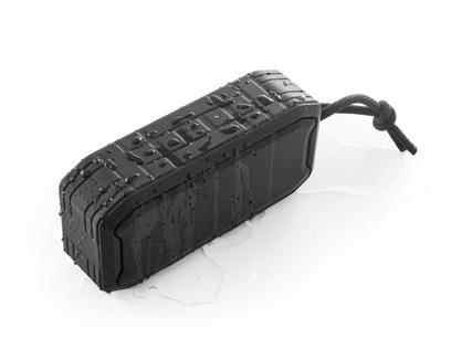 Portable speaker made from recycled ABS (100% rABS), waterproof to IPX7, making it the ideal solution for outdoor use. With BT v5.0 wireless transmission, it has a micro SD card reader, USB-A input and 3.5mm auxiliary input. With 10W of sound power and a battery capacity of 1,200 mAh, it has an autonomy of approximately 9 hours. Thanks to the built-in microphone, you can answer calls and control the volume and playlist of your mobile device. The grille can be fully customised. Includes a USB-C charging cable. Supplied in a kraft paper gift box.