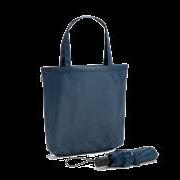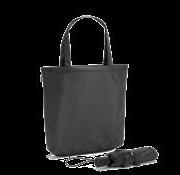 2-in-1 umbrella with recycled polyester shopping bag included. The 21'' folding umbrella in recycled polyester (100% rPET) pongee 190T, fibreglass rods, metal pole and handle in recycled ABS (35% recycled). Folding umbrella in 3 sections, with automatic opening and windproof. Shopping bag in recycled polyester, which can be stored for transport or used separately.