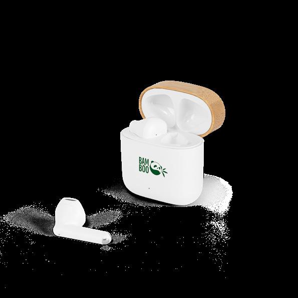 Wireless earphones made from recycled ABS (100% rABS) and a bamboo case with a lid, with BT v5.3 transmission. The charging case has a 300 mAh battery that allows you to charge the earphones approximately 3 times on a single charge, offering an autonomy of approximately 5 hours. The earphones allow you to answer calls, control the volume and playlist on your mobile device. Includes a USB-C charging cable made from TPE recycled (100% rTPE).