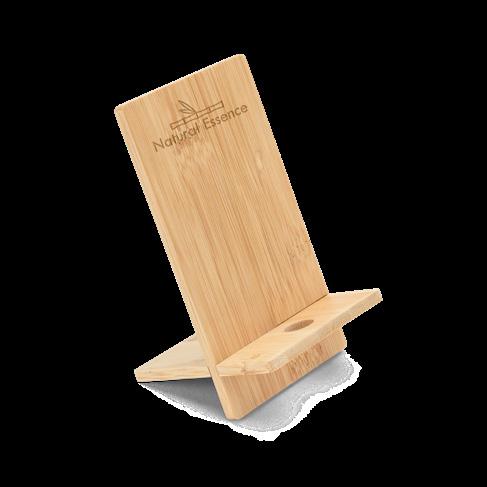 Bamboo mobile phone holder, detachable into two parts. Contains a hole that allows you to charge your mobile device while using the holder. Supplied in a kraft paper gift box.