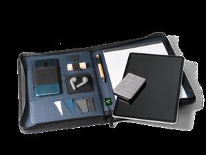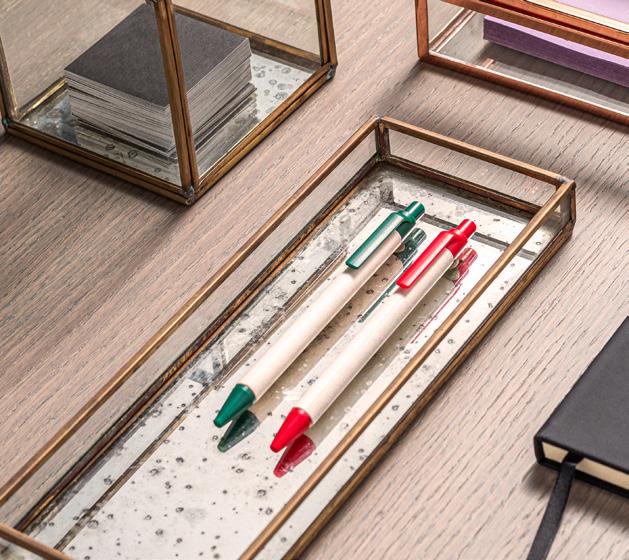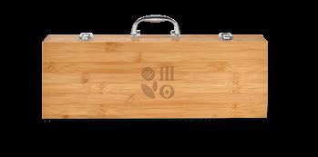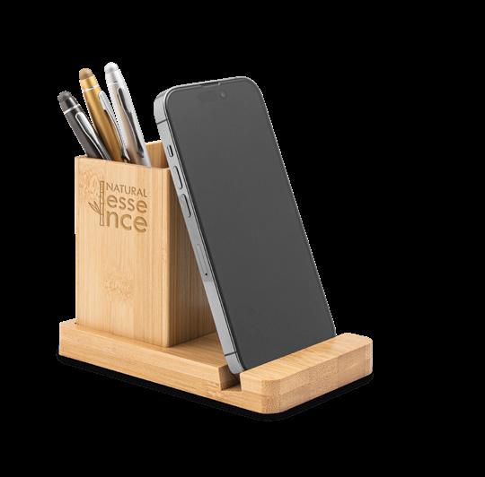 Bamboo desk set, ideal for organizing your work space. Composed of 1 slot to support your mobile device and a removable cup to organize your ballpoint pens and other work materials. Supplied in a kraft paper gift box.