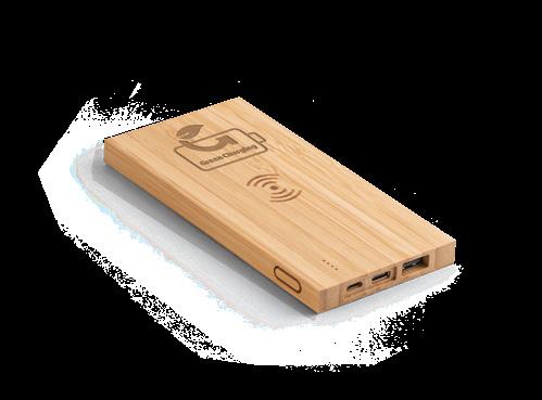 Power bank with wireless bamboo charger. Portable battery with 5,000mAh capacity, charge level indicator, one micro USB input port, one USB-C input/output port and one USB-A output port. The wireless charger has a maximum power of 5W. Includes a USB-C charging cable. Compatible with mobile devices with wireless charging technology. Supplied in a kraft paper gift box.