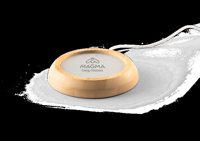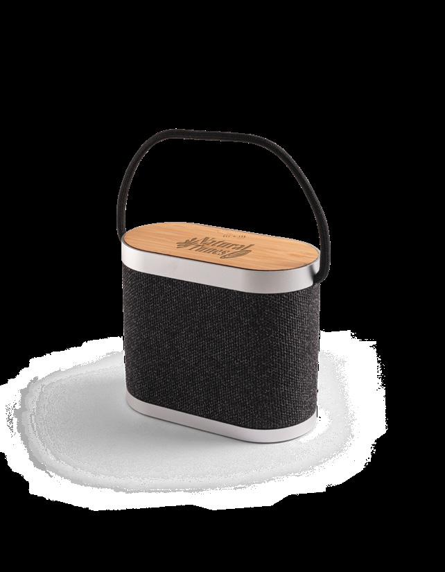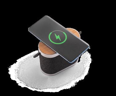 Portable speaker made from bamboo and recycled PET (100% rPET) with a super-fast wireless charger on the top. With BT 5.3 wireless transmission and wireless charging with a maximum power of 15W, it allows for super-fast charging. With 5W of sound power and a 1,200 mAh battery, it has an autonomy of approximately 2 hours. Compatible with mobile devices with wireless charging technology. Includes a USB-C charging cable. Supplied in a kraft paper gift box.
