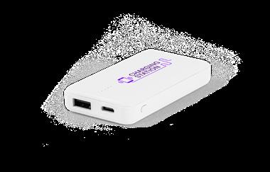 Portable battery with 5,000 mAh capacity, charge level indicator, one USB-C input/output port, one microUSB input port and two USB-A output ports.