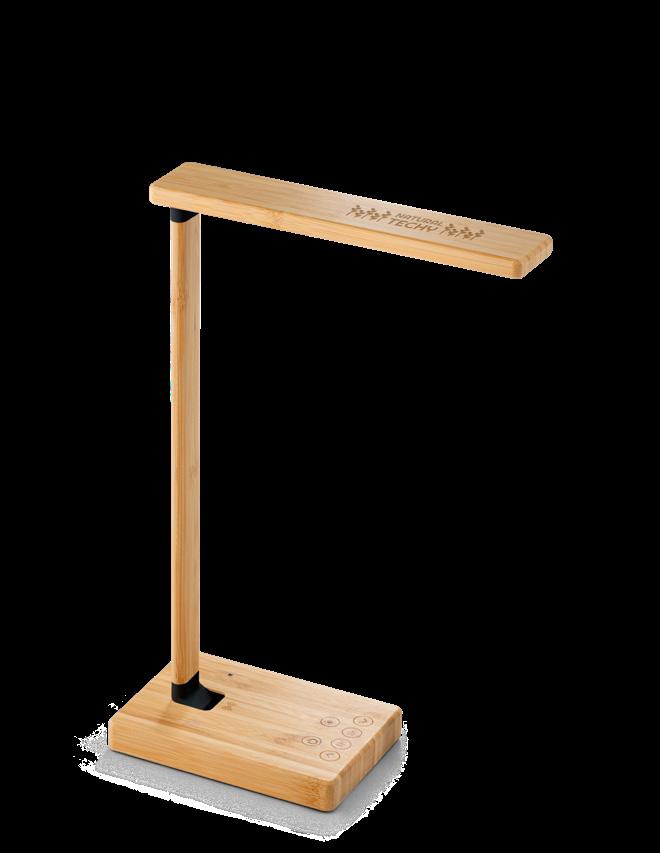 Bamboo folding desk lamp with super-fast wireless charger, with 16 white and 9 yellow LEDs. The wireless charger is super-fast charging and has a maximum power of 15W. The USB-A output port allows you to charge other devices at the same time. Includes a 1 metre USB-C charging cable. Supplied in a kraft paper gift box.
