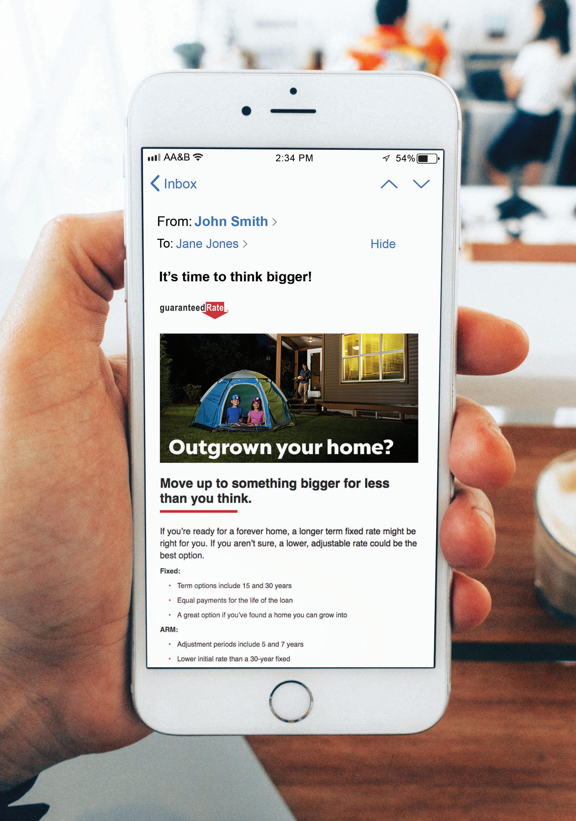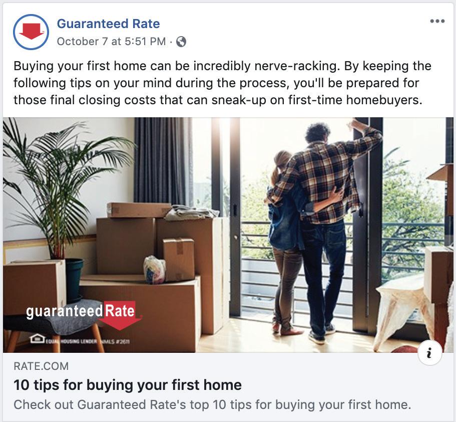 Macaw appraisal waiver eligibility requirements vary by investor and state and may be subject to additional restrictions. Subject property must not have or be required to obtain an appraisal by law. Cash-out refinance’s, property values over $1M, manufactured homes, coops and others are not eligible for approval. Please contact your Guaranteed Rate Loan Officer for full list of ineligible loan types. Applicant subject to credit and underwriting approval. Not all properties will be approved for Macaw appraisal waiver. Not all applicants will be approved for financing. Contact Guaranteed Rate for more information and current rates. Any finding provided through API is a preliminary finding. Final appraisal waiver eligibility shall be provided once a mortgage application is submitted to a Loan Product Advisor. + Site visitors who are retargeted with display ads are 70% more likely to convert + Guaranteed Rate marketing can leverage Adwerx to serve each of your website visitors retargeting ads up to 15x through digital ads + Audiences are retargeted based on contact lists and geofencing in addition to webpage visitors Digital Retargeting Personalized retargeting ad campaigns keep you top of mind with your hottest prospects and help build your brand online. 70% Converstion data source: Kenshoo.com https://kenshoo.com/blog/retargeting-stats/