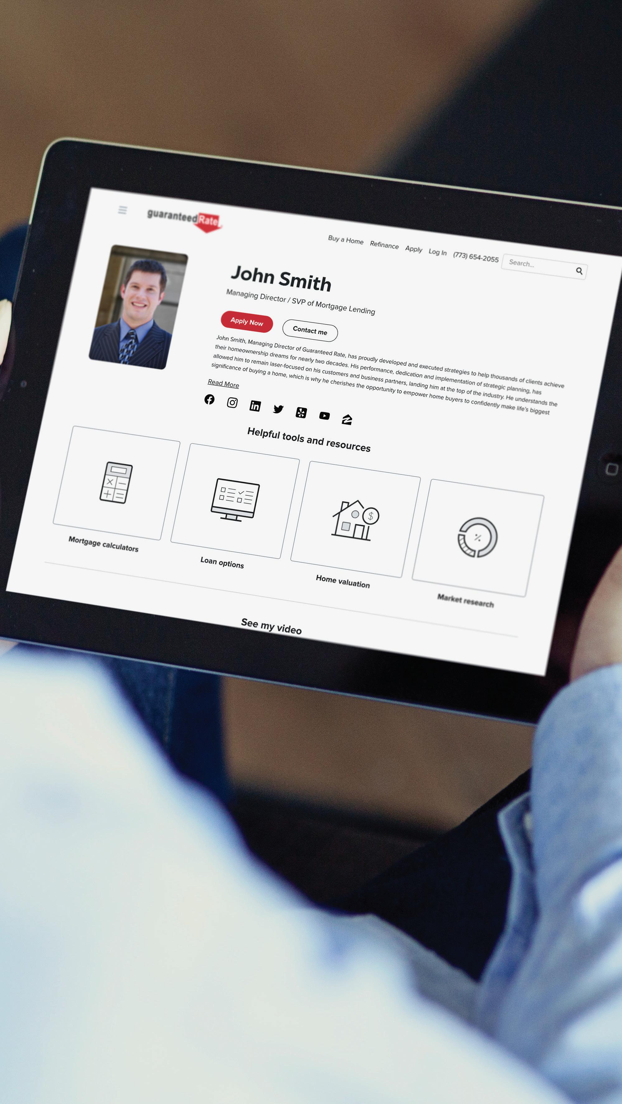 Macaw appraisal waiver eligibility requirements vary by investor and state and may be subject to additional restrictions. Subject property must not have or be required to obtain an appraisal by law. Cash-out refinance’s, property values over $1M, manufactured homes, coops and others are not eligible for approval. Please contact your Guaranteed Rate Loan Officer for full list of ineligible loan types. Applicant subject to credit and underwriting approval. Not all properties will be approved for Macaw appraisal waiver. Not all applicants will be approved for financing. Contact Guaranteed Rate for more information and current rates. Any finding provided through API is a preliminary finding. Final appraisal waiver eligibility shall be provided once a mortgage application is submitted to a Loan Product Advisor. + Your custom webpage includes your contact info, bio, testimonials, Digital Mortgage application, loan products and pricing specific to you + After your customer visits your VP page once, the entire Rate.com experience is customized to ensure that they always return to you + Your website is optimized to receive organic leads directly for you, so you can build your brand and grow your business VP Webpages Make it easy for customers to locate you, see your information and testimonials, and apply.