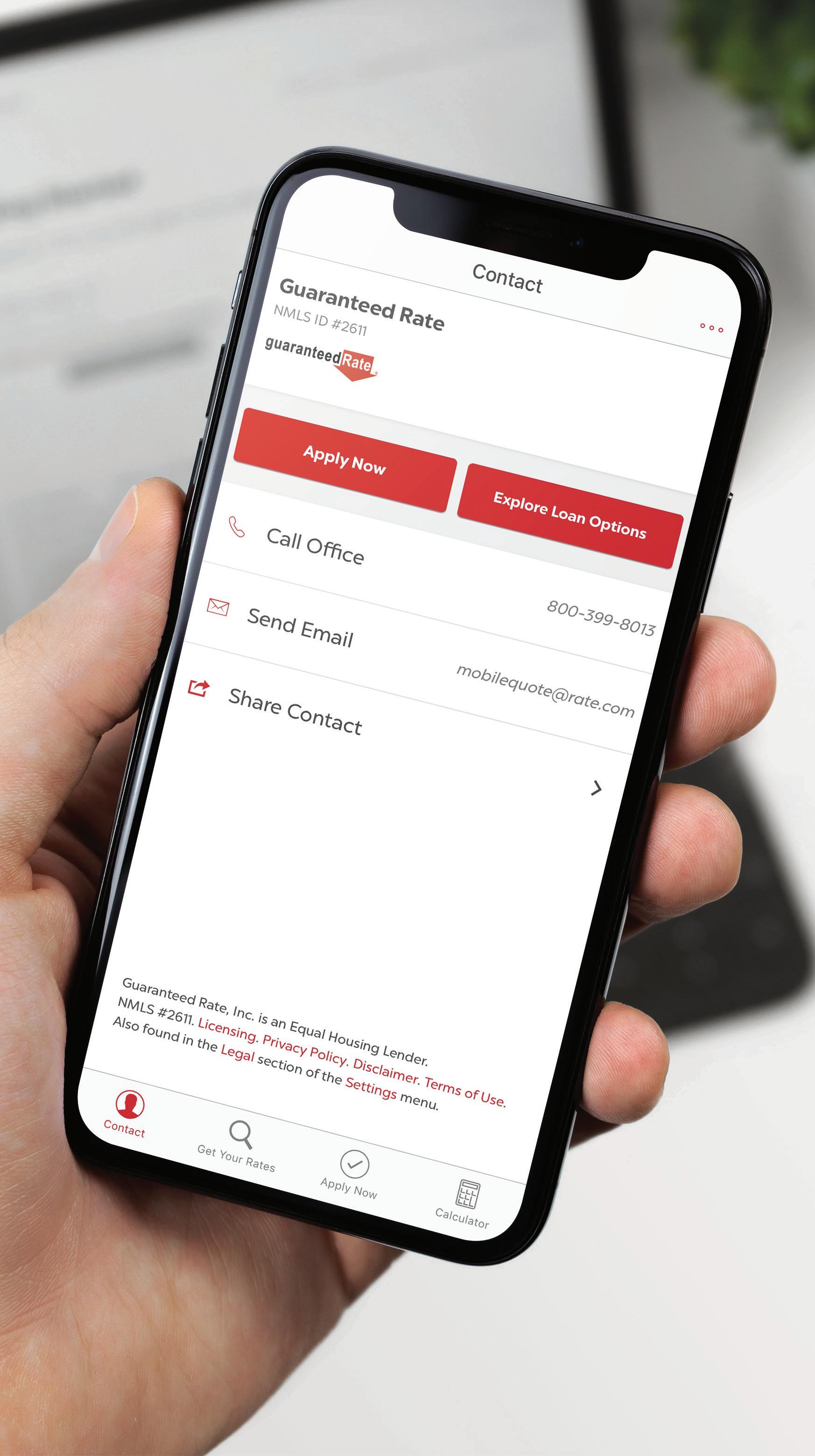 Macaw appraisal waiver eligibility requirements vary by investor and state and may be subject to additional restrictions. Subject property must not have or be required to obtain an appraisal by law. Cash-out refinance’s, property values over $1M, manufactured homes, coops and others are not eligible for approval. Please contact your Guaranteed Rate Loan Officer for full list of ineligible loan types. Applicant subject to credit and underwriting approval. Not all properties will be approved for Macaw appraisal waiver. Not all applicants will be approved for financing. Contact Guaranteed Rate for more information and current rates. Any finding provided through API is a preliminary finding. Final appraisal waiver eligibility shall be provided once a mortgage application is submitted to a Loan Product Advisor. + Incredibly effective during open houses and home tours, the mobile app allows homebuyers and agents to pull up: • Accurate pricing scenarios • Your contact information + The built-in share feature allows for easy referrals + Works on any hand-held device and is integrated with GRaffordable and Digital Mortgage so customers can start the application right away GR Mobile Loan App Your ultimate digital business card.